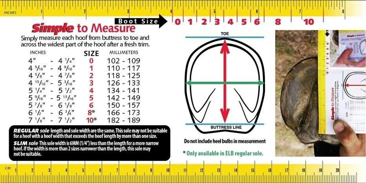 For a perfect fit the width of the hoof, at the widest point, should be within the same size range as the length. E.g. a 102-109mm length will need to have a 102-109mm width. These boots will NOT fit if there is any difference.
