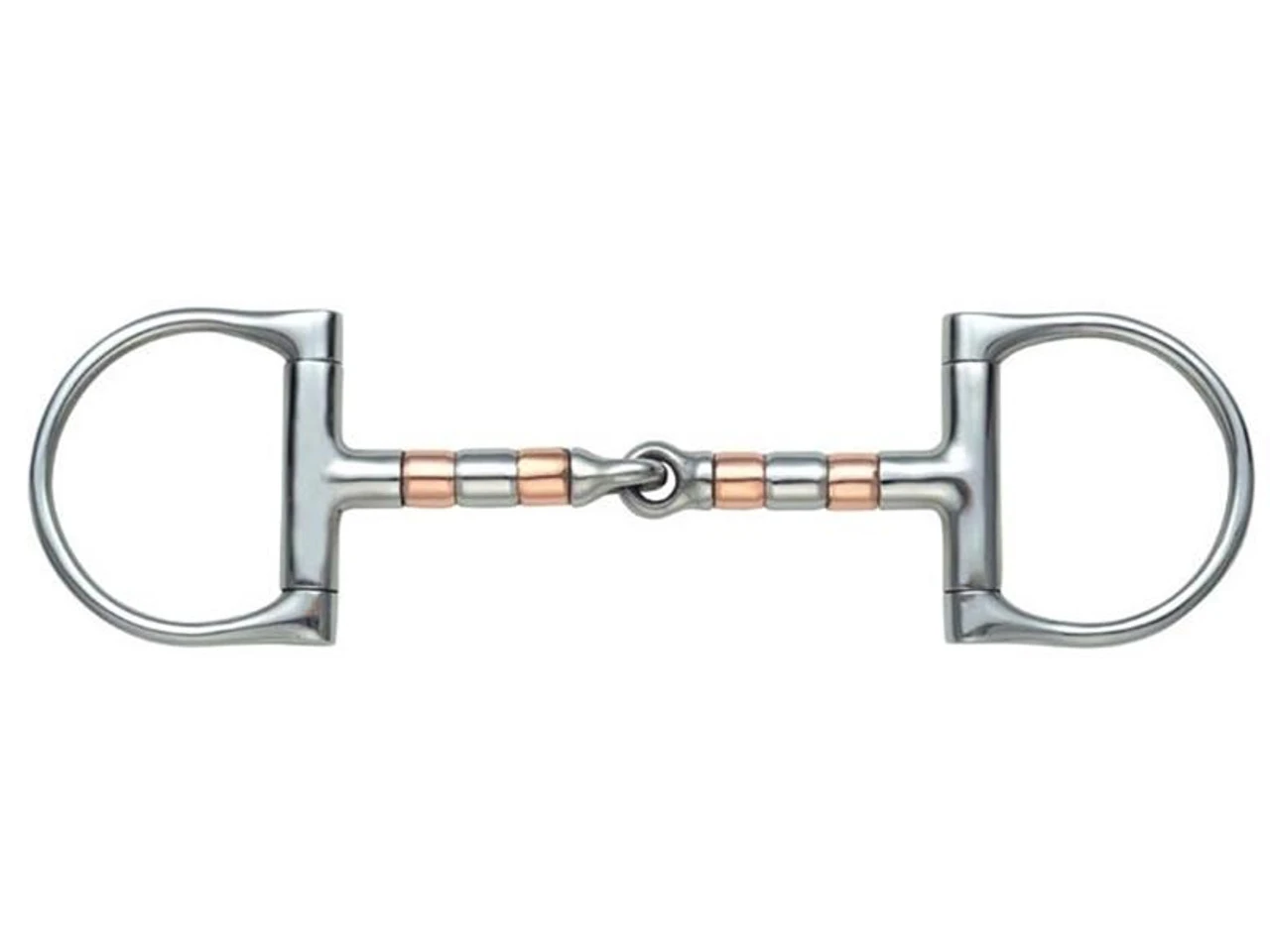 The Dee rings reduce the chance of pinching and help with steering. The single joint makes the copper roller Dee bit more sever than a french link because of the nutcracker action.
