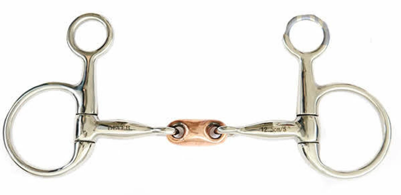 The Double Jointed Copper lozenge version of this bit reduces the nutcracker action, and gives some tongue relief. The copper gives a warm, soft feel in the mouth, which encourages salavation and acceptance.