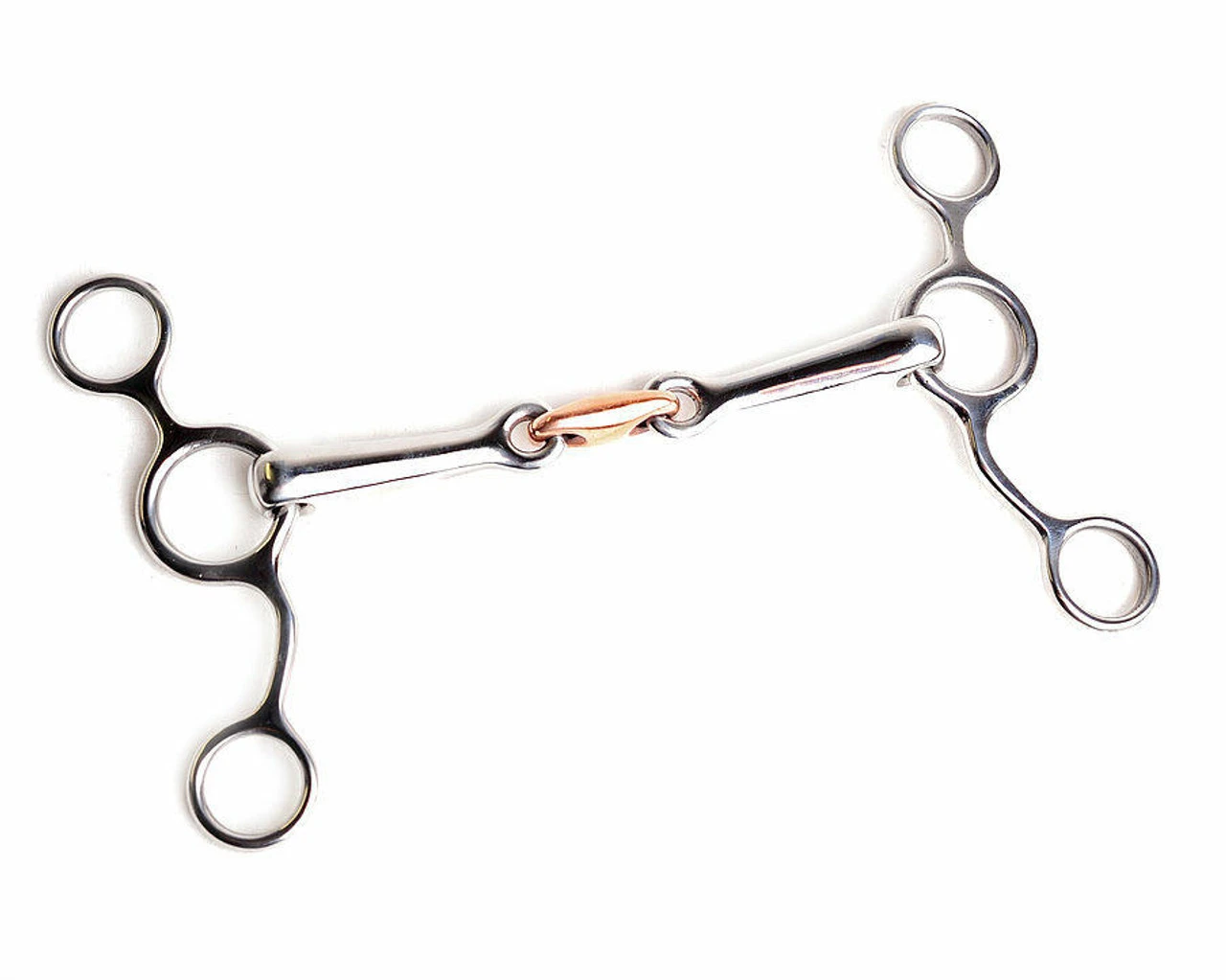 The mouthpiece of this bit is a combination of Stainless Steel & Copper. The Copper lozenge softens the joint action. The Stainless Steel cheeks give leverage, with the reins attached to the lower ring. It encourages the horse to lower its head & also provides brakes.