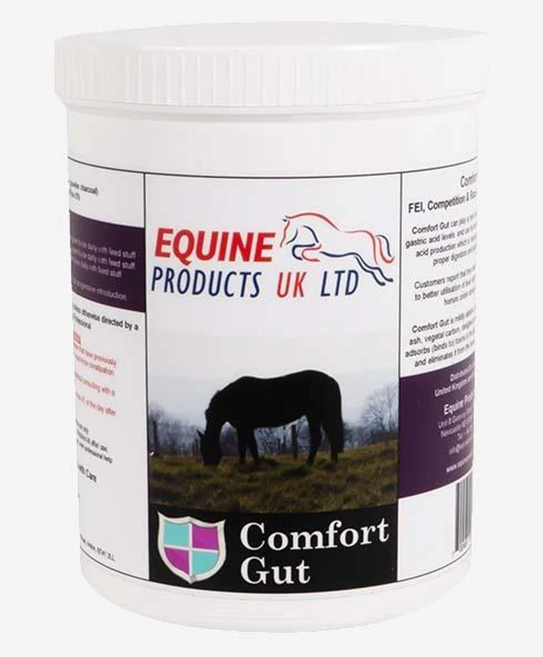 Equine Products Comfort Gut is a mildly alkaline, ultra smooth pored, very low ash, vegetal carbon designed specifically for feeding. It absorbs (binds to) toxins in the digestive tract like excess acid and eliminates it from the horses digestive system in the manure.