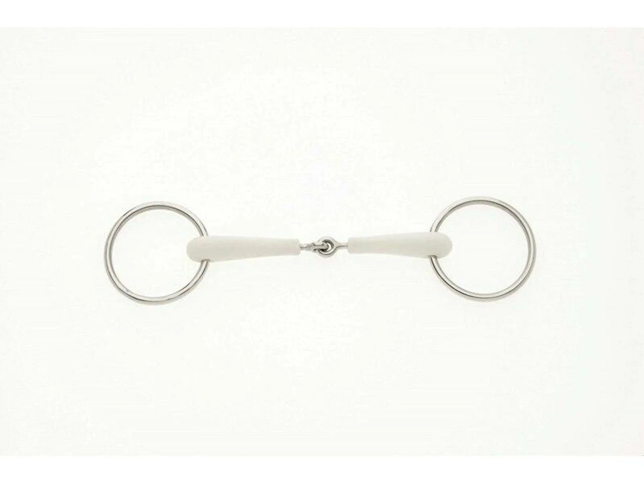 The Flexi Loose Ring Jointed Snaffle has a single joint. The single joint creates a nutcracker action within the mouth, so is considered to be more severe than the french link or lozenge.