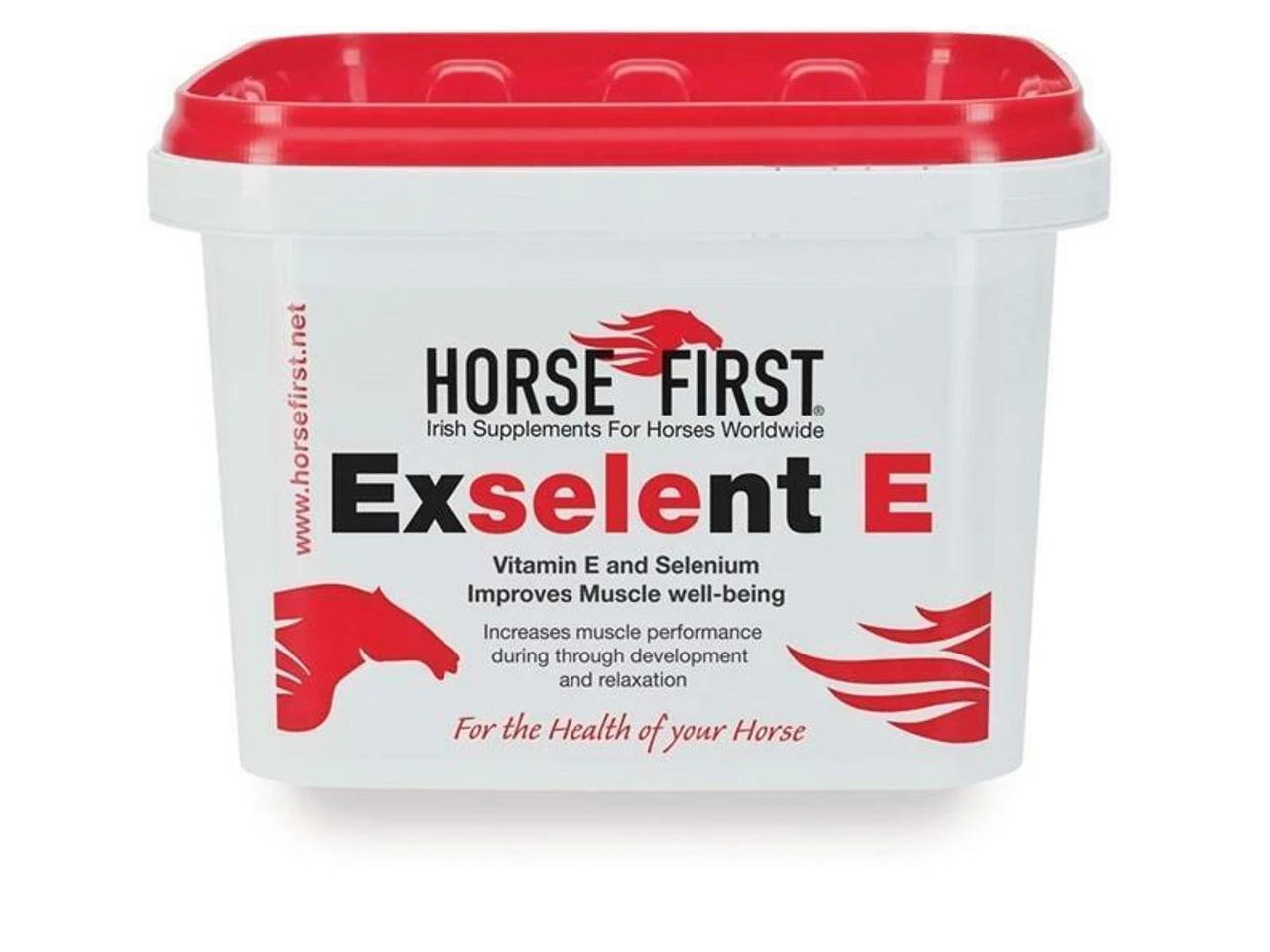 The key ingredients in Horse First Exselent E feed supplement are Vitamin E and Selenium; Vitamin E is a key component in aiding muscle development and can be important in avoiding muscle pain and damage. Selenium can be important in the maintenance of muscle health and to aid suppleness in the muscle tissue during work.