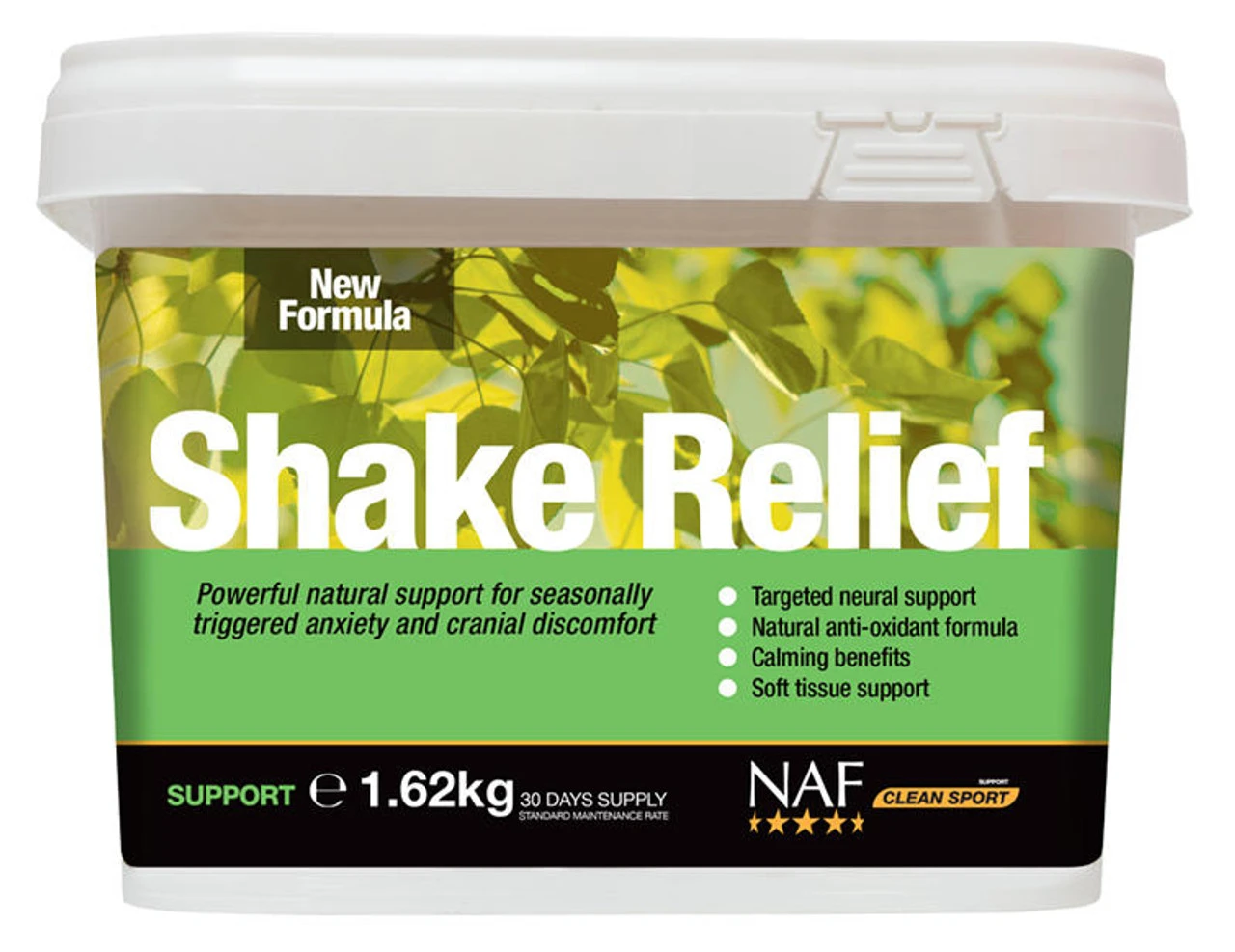 NAF Shake Relief is a supplement for headshakers that provides valuable nutritional support for horses who show signs of seasonal anxiety. Horses may be affected by a number of different seasonal triggers; commonly bright sunlight, pollen or flies, resulting in seasonally associated discomfort and anxiety in the head.