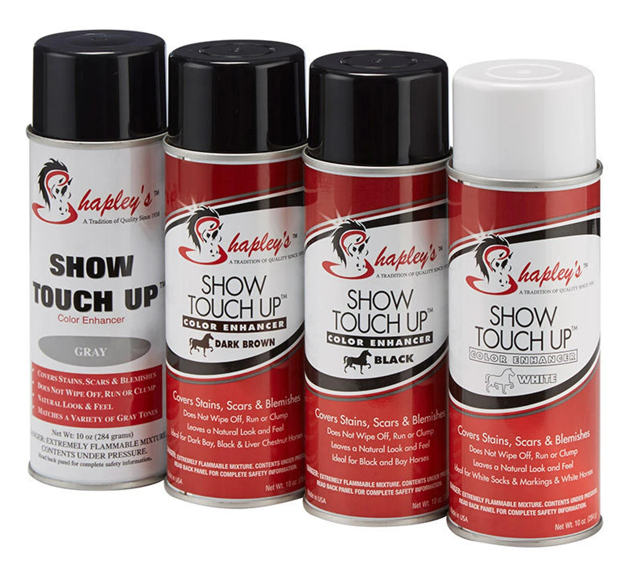 Shapley’s Show Touch Ups were created specifically for horses. This incredible product covers stains, scars, blemishes and flaws on your horse’s coat. It can also be sprayed in tails to create a fuller appearance. Show Touch Ups are a must have for any horse competing or whenever you want to improve the appearance of your horse.