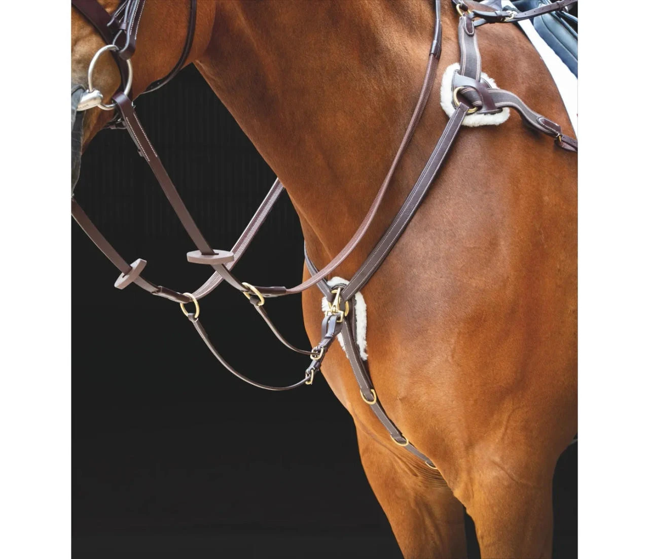 The Shires Leather Five Point Breastplates also feature a detachable and fully adjustable running martingale attachment, elastic inserts in a matching colour and either stainless steel or brass fittings.