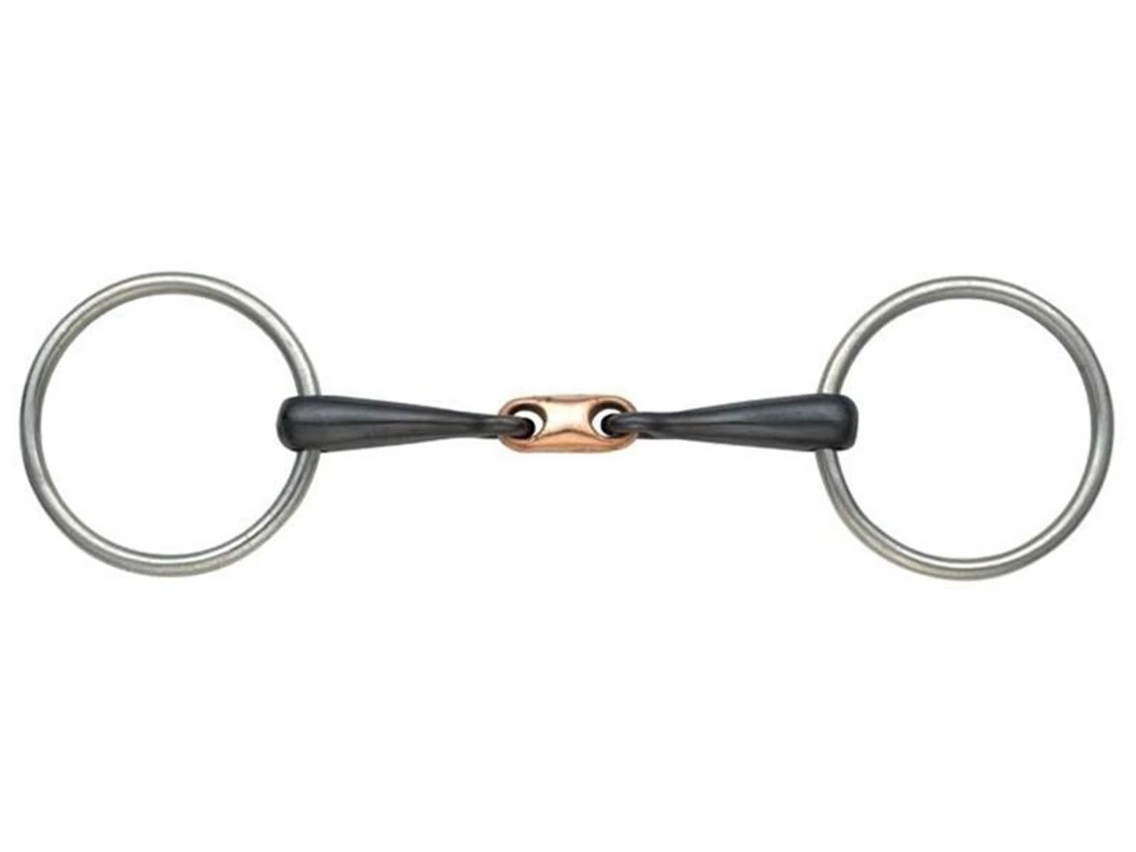 The Sweet Iron Loose Ring Snaffles with a Copper Lozenge are a combination of a sweet iron mouthpiece and a copper lozenge.