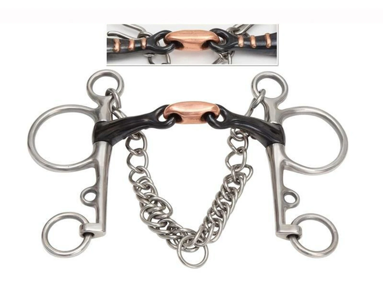 The Shires Sweet Iron Pelham with a Copper Lozenge works by applying a variety of pressures – on the poll, corner bars, tongue and chin groove.