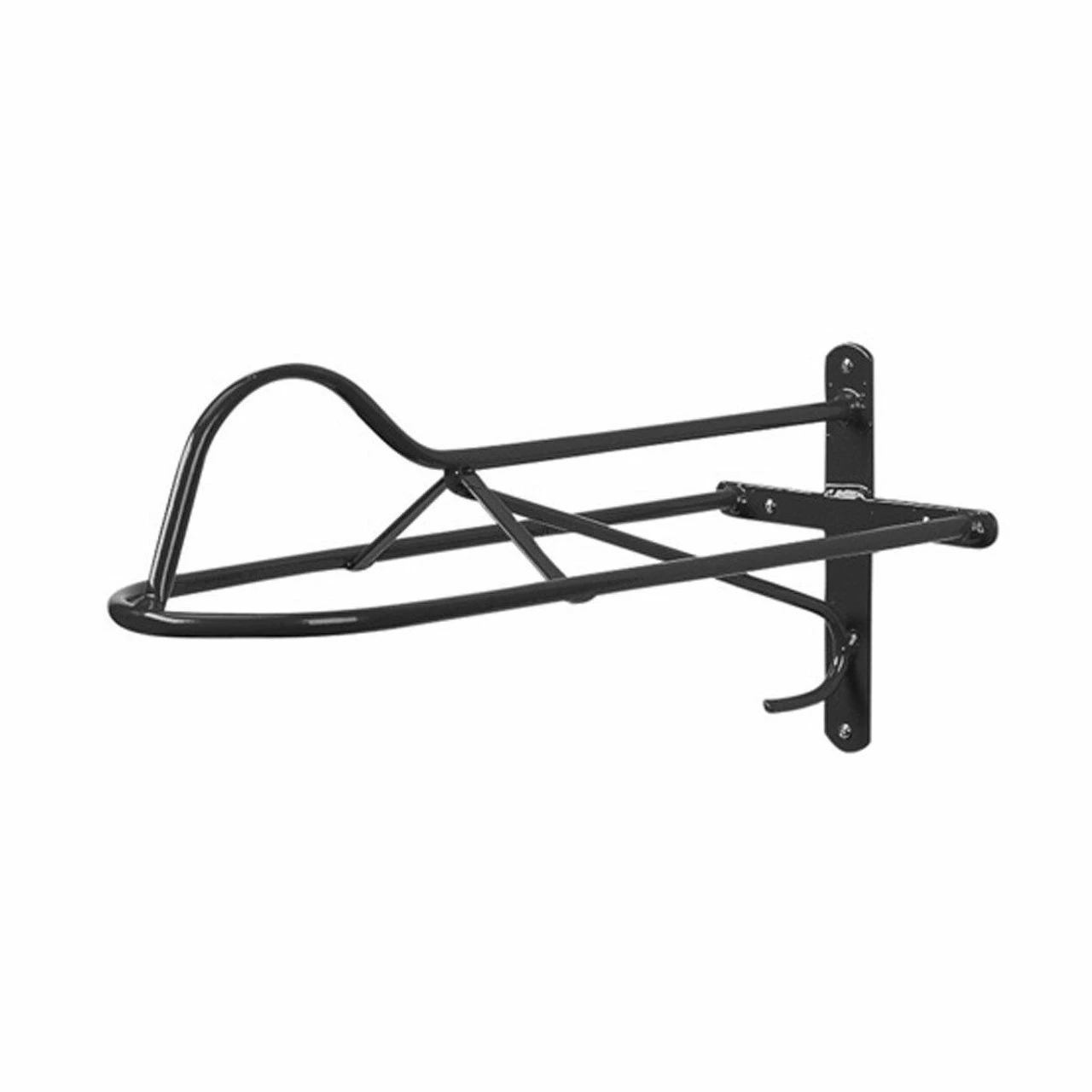 A forward seat saddle rack made from plastic coated steel by WB Stubbs. The forward seat saddle rack is useful to prevent saddle flaps rubbing on the wall when stored.