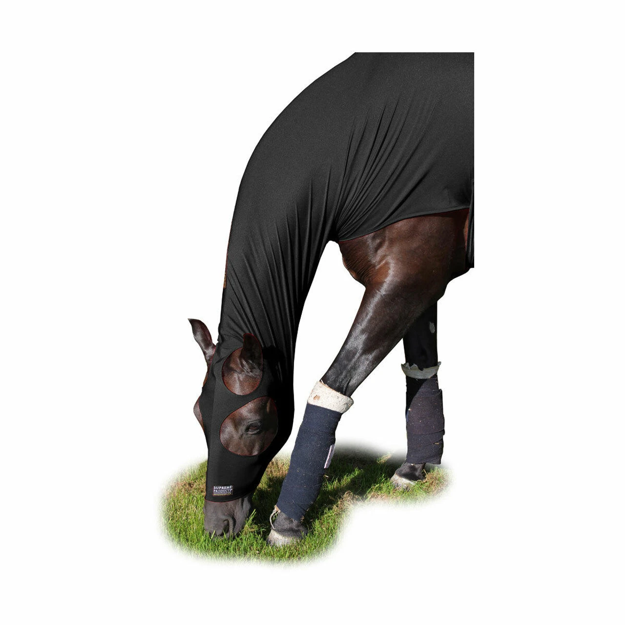 The Supreme Products Lycra Mix Hoods need to be close fitting, but not tight and should be worn over the top of rugs and attached to a surcingle or roller with the elasticated hoops as provided on the hood.