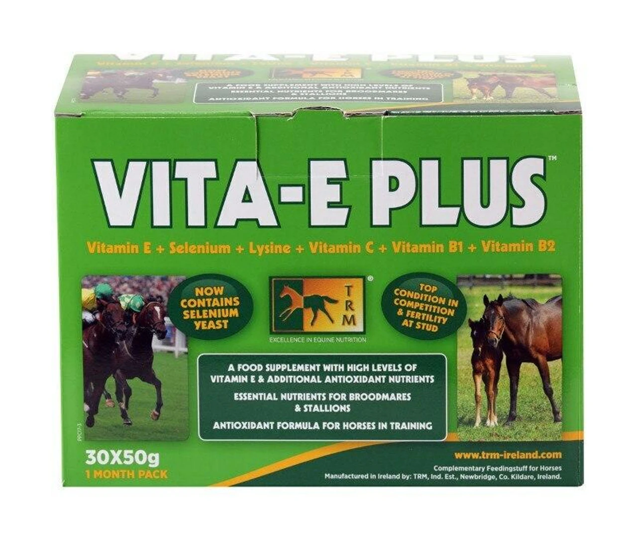 TRM Vita-E Plus is a feed supplement which combines the anitoxidant activity of Vitamins E, C and Selenium with Lysine and vitamins B1 and B2. TRM Vita-E Plus provides all the elements to aid in the prevention of azoturia/ set fast (tying up) in exercising horses Feeding TRM Vita-E Plus also ensure will that stallions and broodmares have sufficient levels of nutrients during the winter months for performance and fertility. Feed: Horses in training, broodmares and stallions – 50g/day Yearlings and weanlings – 50g every other day Available in 30 x 50g sachets, 5kg or 10kg