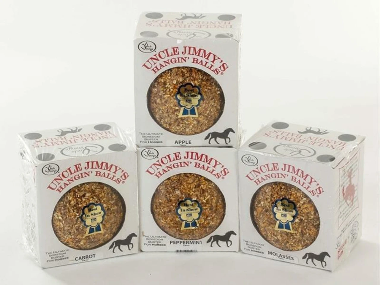 Uncle Jimmy’s Hanging Balls are the perfect treat for your horse. He or she will spend hours trying to lick and grab this entertaining ball. Not only is it great tasting but it is packed with vitamins and minerals that are essential for the horse’s everyday needs. Don’t let him pin it against a wall. Also available in Sugar-Free for all those laminitic insulin-resistant equines. Up until now the horse treat industry has neglected to focus on those horses that have developed Cushings disease, Laminitis, Founder or Insulin Resistance. Now these horses can also enjoy the ultimate boredom buster. An excellent addition to their restricted diet. Does not contain Molasses or syrups. 1.59kg ball with string for hanging it up.